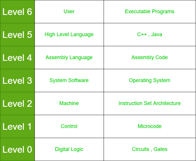 Abstraction: Each level in the hierarchy provides a level of abstraction from the underlying hardware, allowing software developers to write programs that are independent of the specific hardware components in the system.