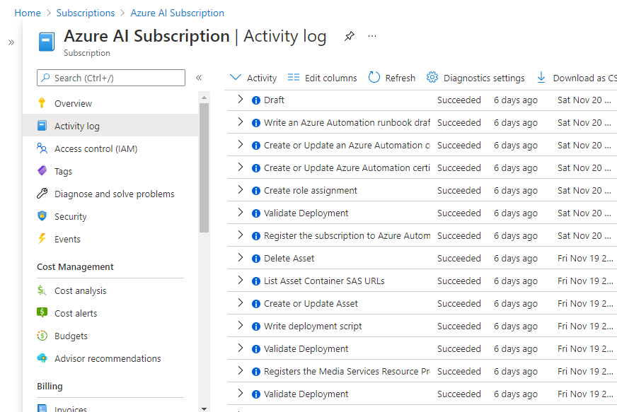 You can check the activity logs of Operation Name, Status, Time, Subscription, and Event initiated by.