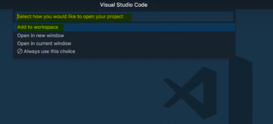 We are going to select "C sharp." Now it's asking, "How would you like to open this projects?" We are going to select "Add to workspace."