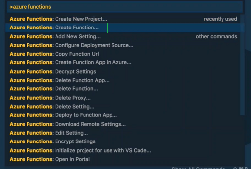 Now, the next thing we need to do is actually create a function. If we open the command line and we type "azure functions", we can go down to "Create function".