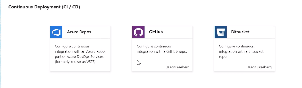 Below is a web app, go into the Deployment Center on the left. And there, you will have options for Azure Repos, GitHub, and Bitbucket.