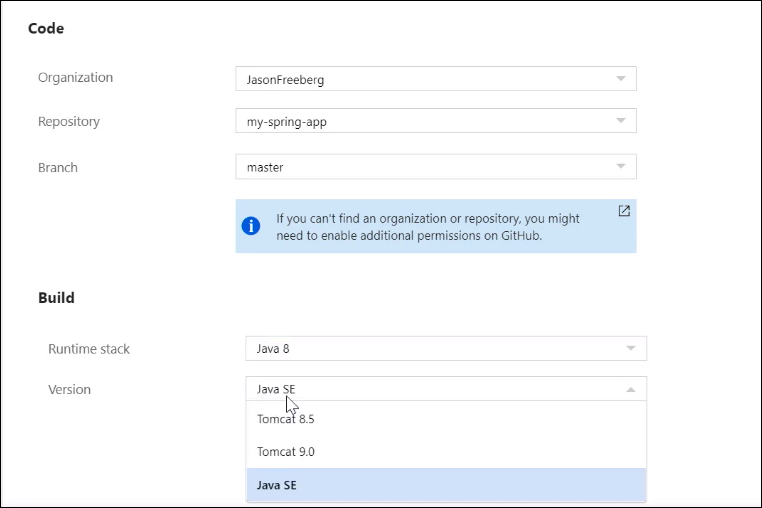And now on the next screen, select your repository. Select your username. And then your Spring application that you are going to deploy. It could be any branch, but for example, if you have chosen the master branch. Then, use Java 8 to continue the process. Since you are deploying a Spring Boot application, choose Java SE. If you were deploying a Tomcat application, you could choose one of the Tomcat versions.