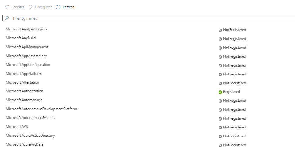 If you want to Register a one just select the resource provider of your choice or you can search for the required resource provider then click on "Register" to register the service in your select subscription. At max, it will take 10-20 seconds to register.