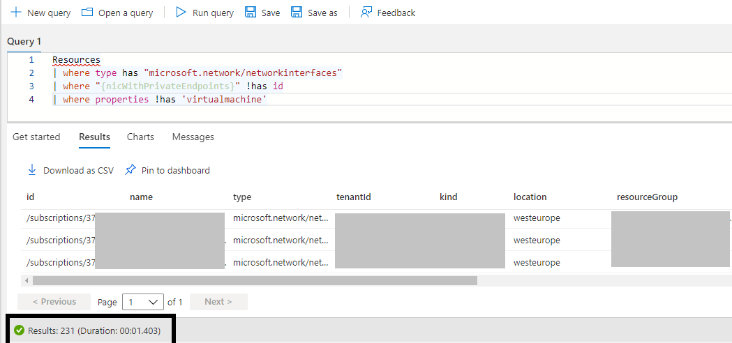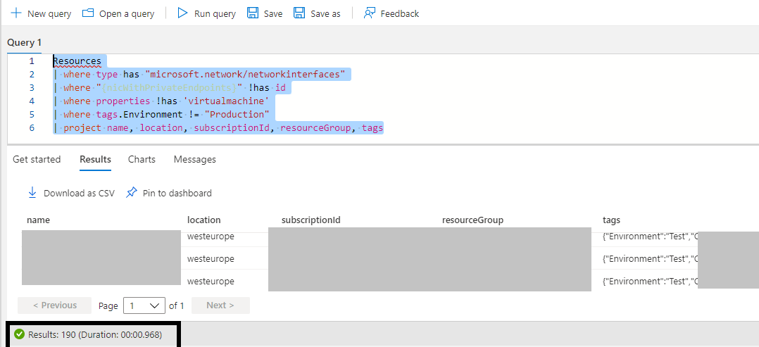 Step 4: Paste the below query in the query box and click on the Run query to get the list/report of unattached NICs.