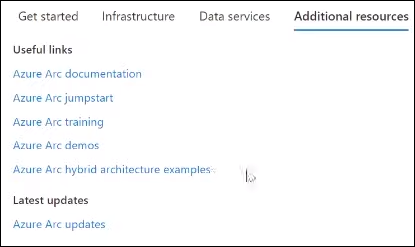 In the documentation,  you can learn more about Azure Arc as well as the use of installation guides. You can look for Azures blue to learn more links to get directed into specific articles or head to the additional resources tab where Azure has compiled useful links. Azure has its documentation hub, Azure's jumpstart repo, relevant training and demos, and hybrid architecture examples. Azure jumpstart repo is a great place to get started with Arc, especially if you are a beginner and do not prefer UI.