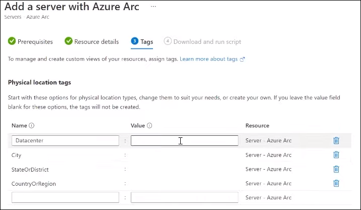 If you click into servers, you will be taken to a create, which will help to bring on-premises VM into Azure for management. This page takes you through a bunch of prerequisites that you need to make sure you have squared away before proceeding. On this page, you are asked to provide a bit of information. And, you can also optionally use these physical location tags to represent where this resource lives outside of Azure.