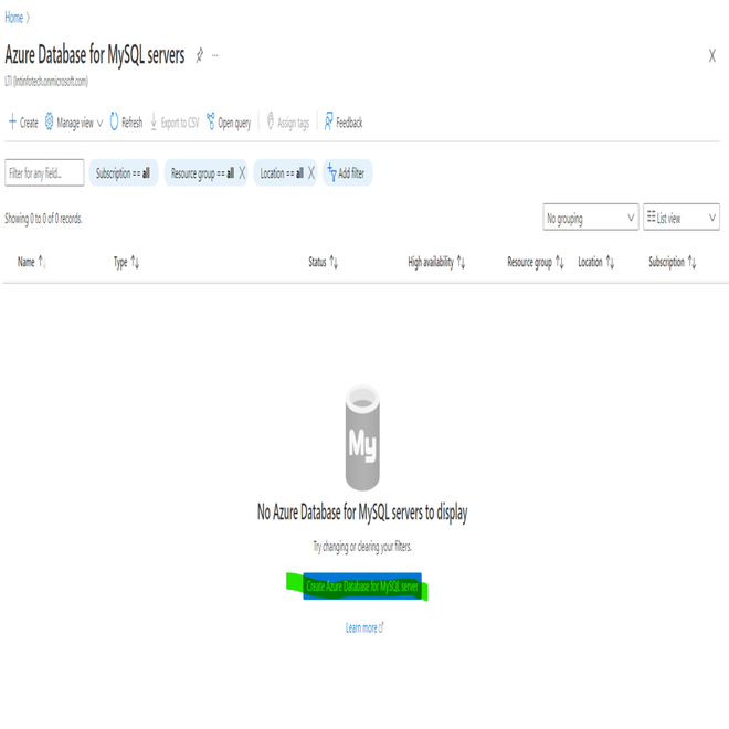 Azure portal home page- Type Azure Database for MYSQL in the search bar and hit enter. On the page that opens, click "Create Azure Database for MYSQL Server".