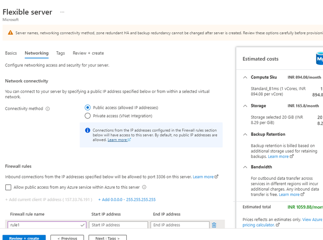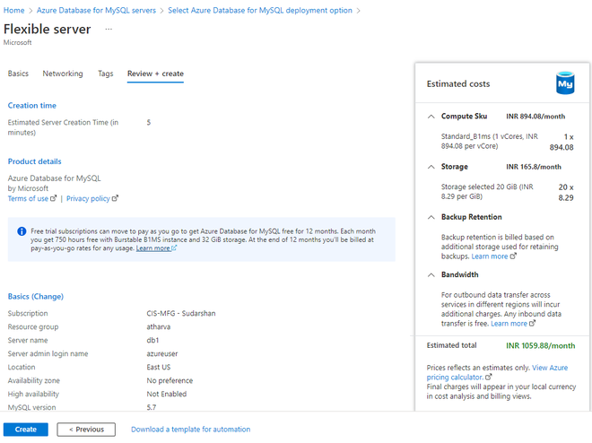 Flexible Server Deployment- On the following page, under the "Basics" tab, enter information like your subscription and resource group. Note that you can also create a new resource group at this stage. This is followed by your server details and account details. On the right pane, you'll be able to see the approximate cost of resources as you toggle different options.