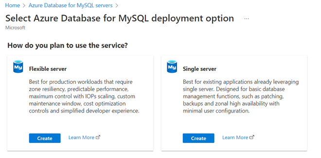 Azure Database for MYSQL- Select a deployment option. In this case, we're going with Flexible Server Deployment.