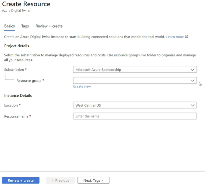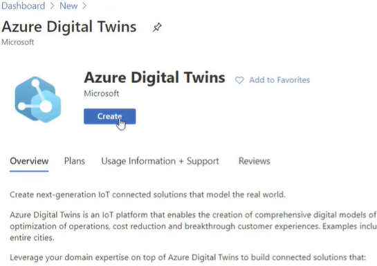 Let's see how that works. First, we need to create an Azure Digital Twins service in Azure. Let's search for Digital Twins and Create it.