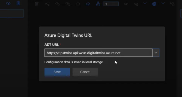 First, we need to connect to the Azure Digital Twins using this button at the top and enter the URL, which is the service's hostname, with HTTPS in front of it.