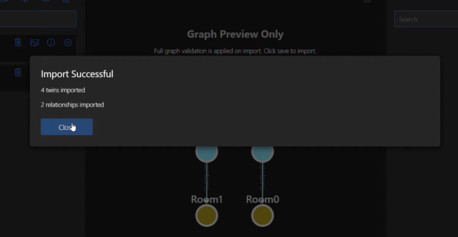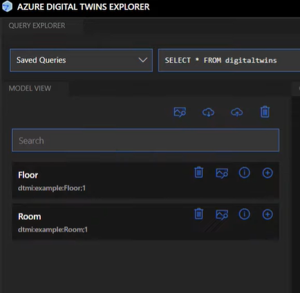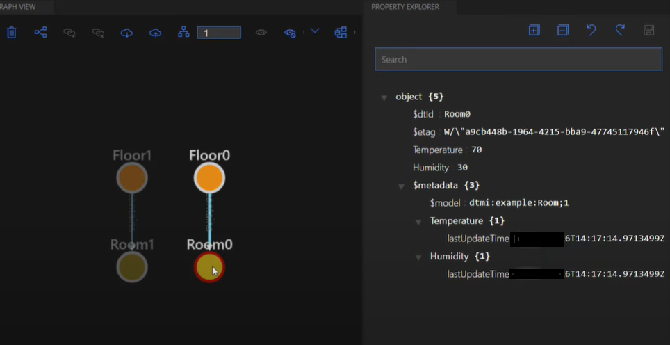 Now, we can run a query against the twin graph in Azure to retrieve the information. This is a representation of a real-world environment containing two floors that each contain a room. Each one is a Digital Twin, which you can create with the modal definitions.