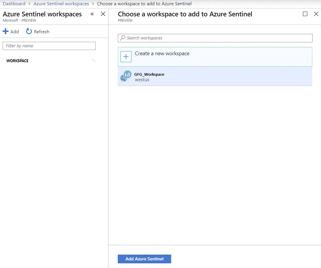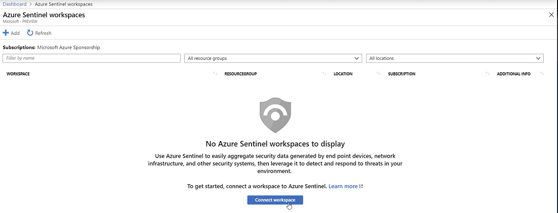 This will create a workspace for us and now we need to Add Azure Sentinel.
