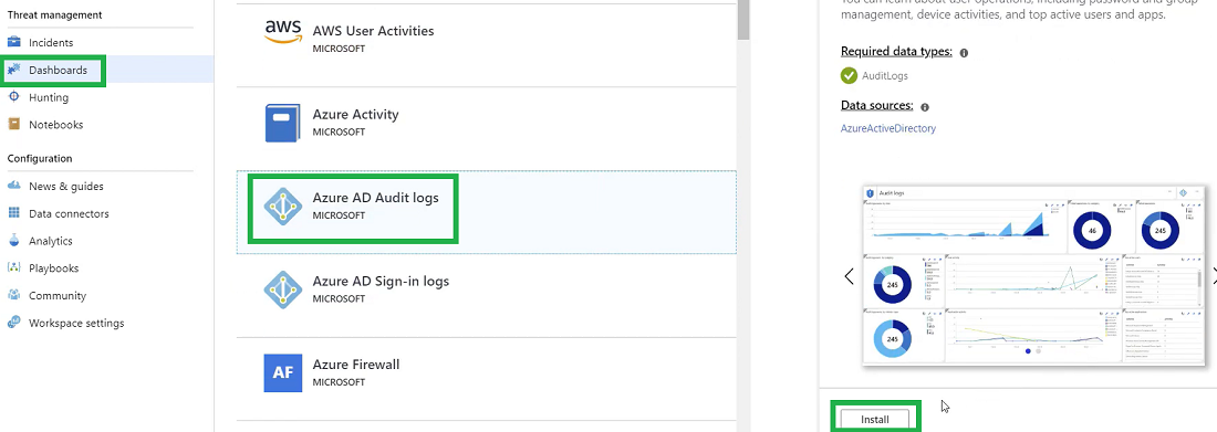 We can visualize the data in dashboards. Here, we can choose out of many pre-built dashboards, like this Azure Active Directory Audit Logs dashboard. Let's install that and let's take a look at it.