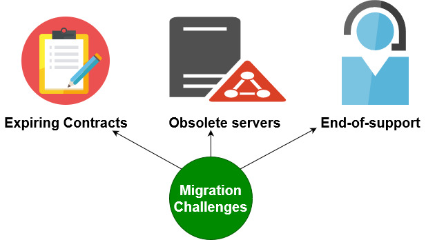 Migrating to the cloud can help address infrastructure challenges like expiring data center contracts, obsolete servers, and end-of-support for software.