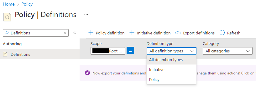 Step 7: Go to Next: Policies and Add the policies definitions and/or initiative definitions to export. Each selected definition and that definitions related assignments for the chosen scope are exported as a directory to the branch in the GitHub repository