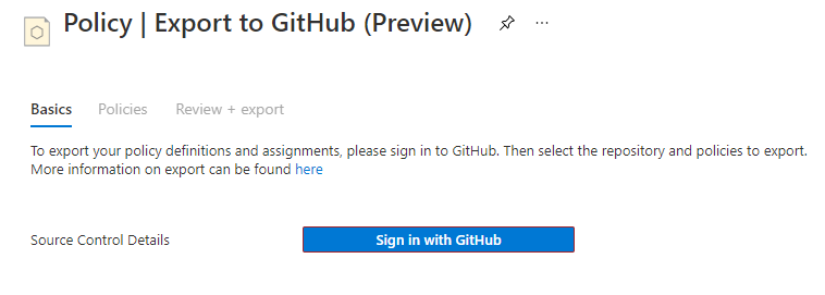 You can manage and deploy export policy resources using GitHub Workflows and Actions. To export your policy definitions and assignments, you should have GitHub Account or Org GitHub Account access to implement the activity. The purpose of exporting policies to GitHub is to have source version control audit details.