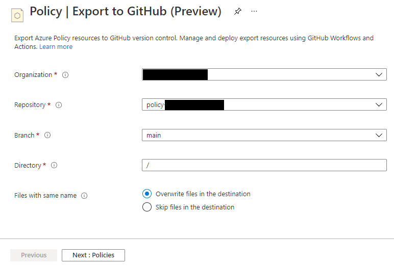 Follow the below steps to manage and export Azure policies with Github Integration: