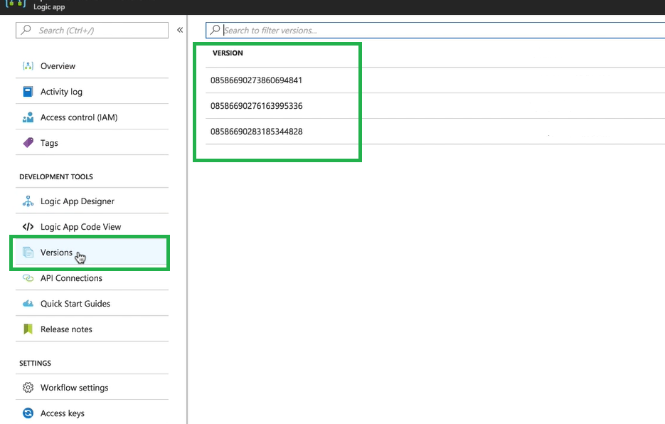 Microsoft Azure - Roll Back Versions of Azure Logic Apps Last Updated : 31 Mar, 2023 Comments Improve Suggest changes 1 Likes Like Report In this article, we will look into how you could quickly roll back to a previous version of an Azure Logic App. When working with Logic Apps inside of the Azure portal, you may need to go back to your previous version of your Logic App. Now follow the below steps to roll back the previous version of your Logic app: Step 1: Inside of our Logic App, we'll select "Version". Step 2: Now we'll be presented with the various versions that were saved of our Logic App. We could select one. Step 3: Inside of the Azure portal, the designer will load with that previous version. We could click through these various sections and we can see what some of the differences might be. Step 4: If we wanted to promote this particular version to be the current version, we can click this "Promote" button. Now, this would be the current version of the Logic App that's actually running. Create Quiz Comment D ddeevviissaavviittaa Follow 1 Improve D ddeevviissaavviittaa Follow 1 Improve Article Tags : Microsoft Azure DevOps Cloud-Computing Explore DevOps BasicsWhat is DevOps ?6 min readDevOps Lifecycle10 min readThe Evolution of DevOps - 3 Major Trends for Future7 min readVersion ControlVersion Control Systems5 min readMerge Strategies in Git4 min readWhich Version Control System Should I Choose?5 min readCI & CDWhat is CI/CD?7 min readUnderstanding Deployment Automation4 min readContainerizationWhat is Docker?8 min readWhat is Dockerfile Syntax?5 min readOrchestrationKubernetes - Introduction to Container Orchestration4 min readFundamental Kubernetes Components and their role in Container Orchestration12 min readHow to Use AWS ECS to Deploy and Manage Containerized Applications?4 min readInfrastructure as Code (IaC)Infrastructure as Code (IaC)7 min readIntroduction to Terraform15 min readWhat is AWS Cloudformation?14 min readMonitoring and LoggingWorking with Prometheus and Grafana Using Helm5 min readWorking with Monitoring and Logging Services5 min readMicrosoft Teams vs Slack4 min readSecurity in DevOpsWhat is DevSecOps: Overview and Tools10 min readDevOps Best Practices for Kubernetes11 min readTop 10 DevOps Projects with Source Code [2025]8 min read Like