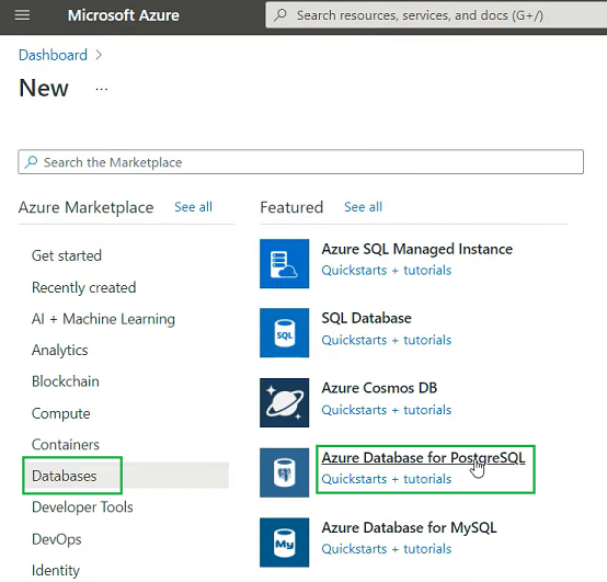 Step 1: In the Azure Portal, we'll start by creating a new Azure Database for Postgres SQL.