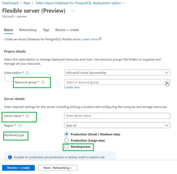 Step 3: Now, select a resource group and give it a name. Then pick the Development workload type.
