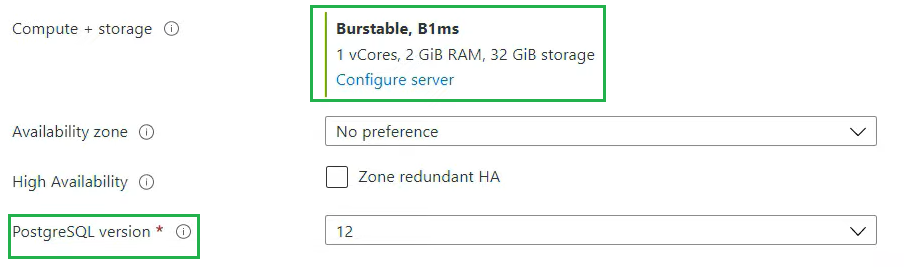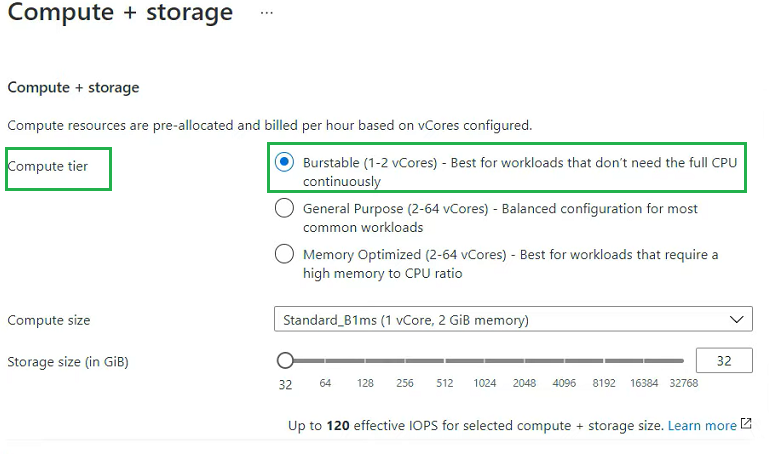 Let's take a closer look at the compute and storage. Because we chose the development workload, this is preset to a Burstable compute tier which is a feature of Flexible Server. This saves costs by only increasing CPU power when we need it.
