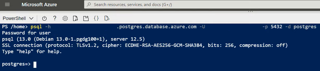 Step 7: Now we'll connect to the created server from here in the Azure Cloud Shell. You can use any tool you prefer to connect to the server. Here, we use these commands which use the Postgres SQL.exe tool that is pre-installed in the Azure Cloud Shell. Put in my password and that's it. We are connected to the server.
