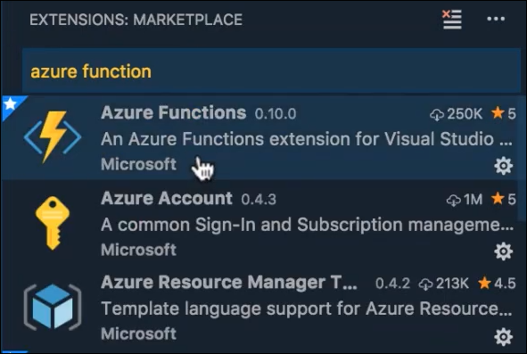 Step 1: To start working with Azure functions inside of Visual Studio Code, we're going to need to make sure that we have the extension of the Azure functions installed. So inside of the marketplace, we are going to type "Azure Functions," and select the "Azure Functions Extension."