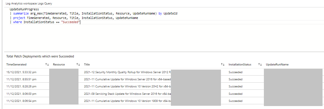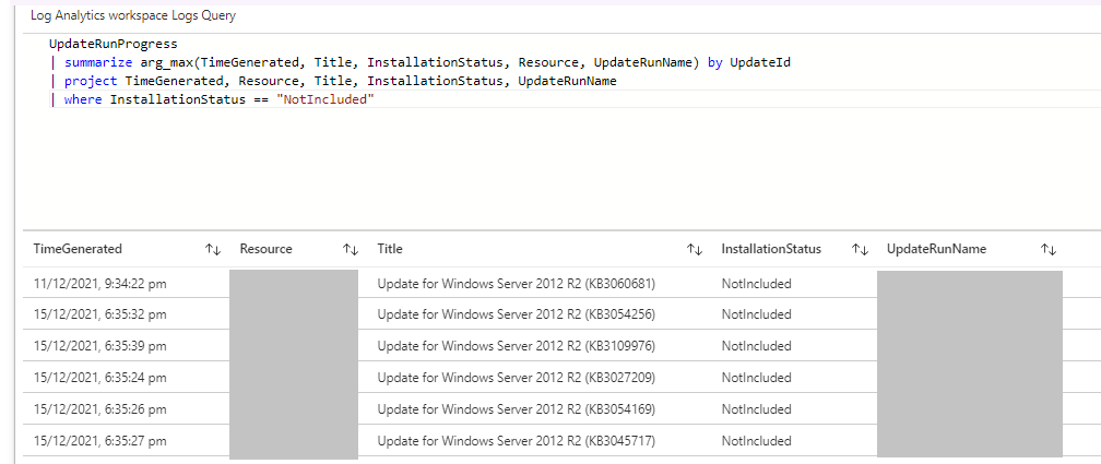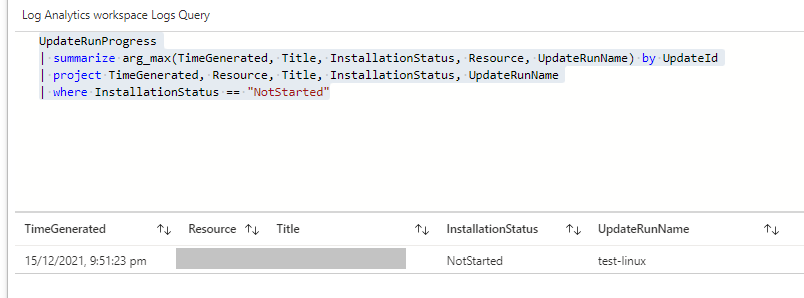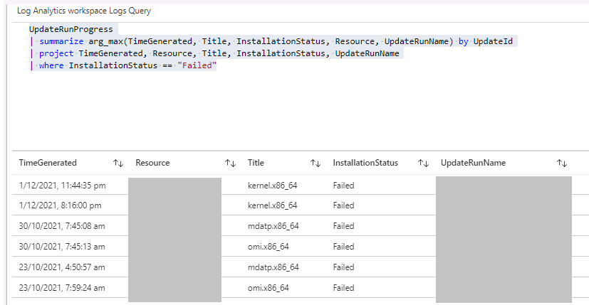 | project TimeGenerated, Resource, Title, InstallationStatus, UpdateRunName
