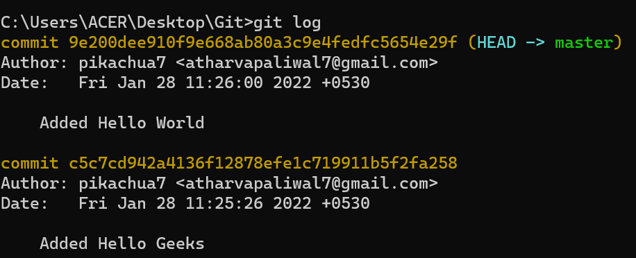 The first part gives us the same result as when we type the git log command which tells us about the commit history of the commit id.
