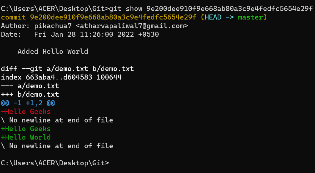 We can see that there is a lot of information that we got when we use git show command. From the above image, we can infer that git show command shows us 2 things