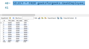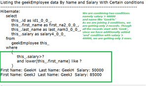 "Listing the geekEmployee data By Name and Salary With Certain conditions");