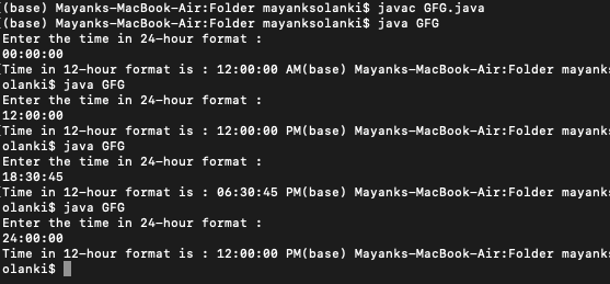 Here only inbuilt methods are used as listed below in tabular format and the role of them in conversion. Time is concerned with AM/PM markers in 12 format standard from 24 hour format without even importing Date class.