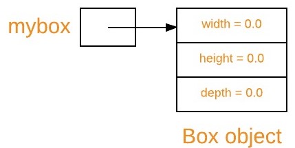 A variable after second step, currently refer to a class object, can be illustrated as follows (the variable name, mybox, plus a reference pointing to Box object):