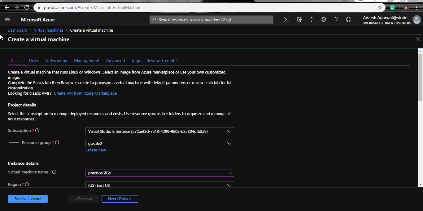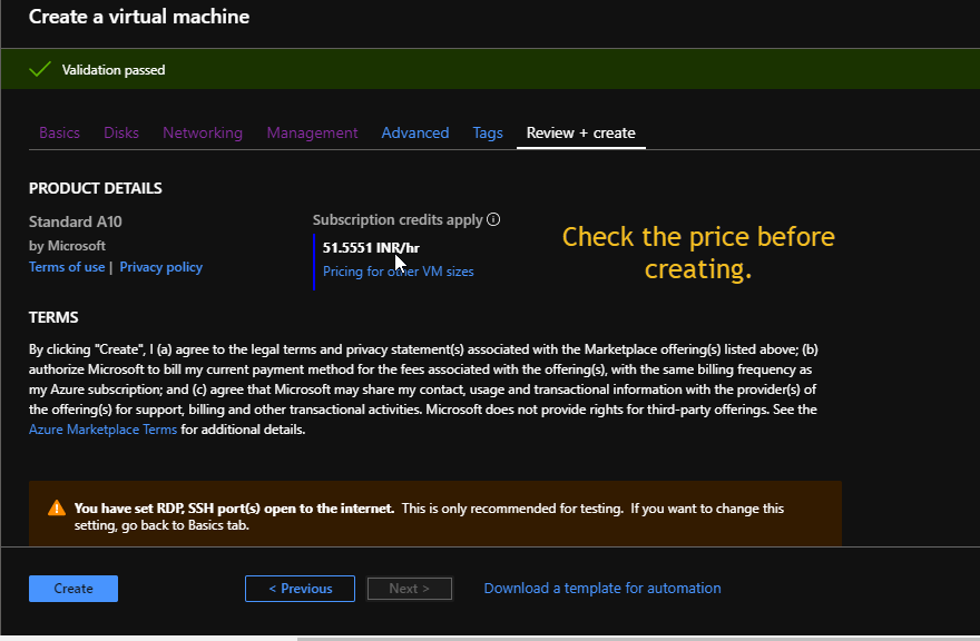 Step #4: Validation and Creation of the Virtual Machine: After clicking on Review + Create button, Azure will validate the settings and will return error if found. Virtual Machines can be expensive. Microsoft charges hourly for the Virtual Machine. To save the cost, you can shut down the machine when you are not using it.