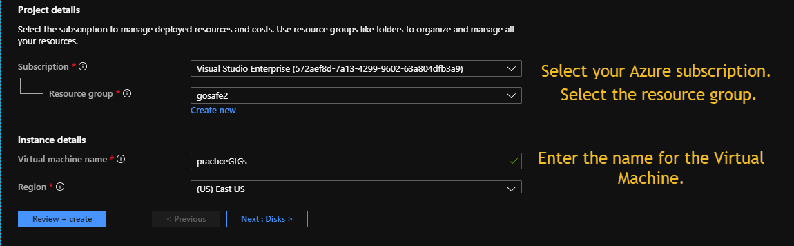 1) Select your Azure subscription. 2) Select the resource group. 3) Enter the name for the Virtual Machine.