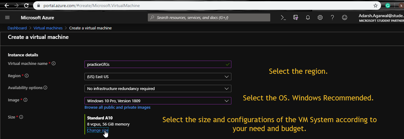 4) Region: Cloud servers are placed at different locations. Choose the region closest to your current location. 5) Select the operating system as per your wish. 6) Size: Select the configurations such as RAM, number of CPUs, storage unit, etc. Select the most suitable configuration setting according to your requirements and budget.