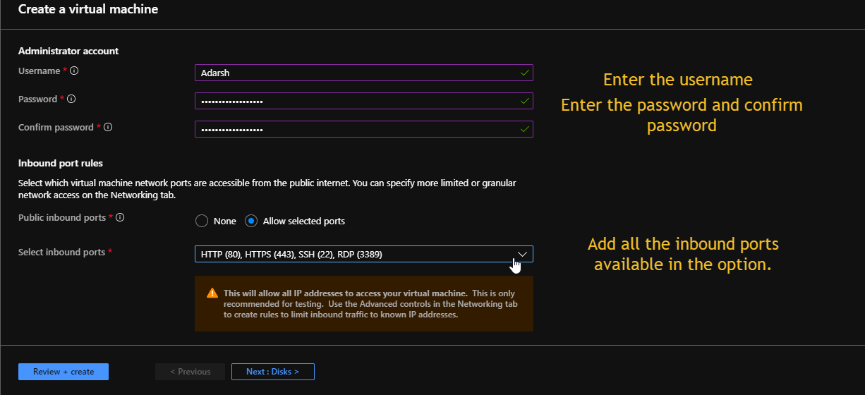 7) Username: Enter the username for the Virtual Machine. Remember it as it will be required for logging into the Virtual Machine later. 8) Password: Enter the password for the Virtual Machine. Remember it as it will be required for logging into the Virtual Machine later. 9) Inbound Ports: Select all the inbound ports available in the options.