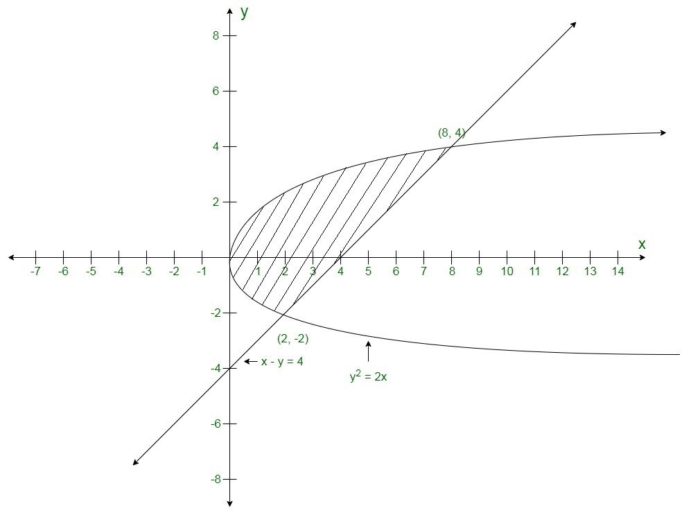 Question 4. Find the area of the region bounded the parabola y2 = 2x and straight line x − y = 4.
