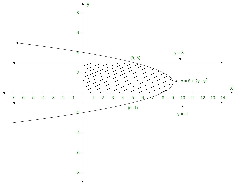 Question 2. Find the area bounded by the parabola x = 8 + 2y − y2; the y-axis and the lines y = −1 and y = 3.