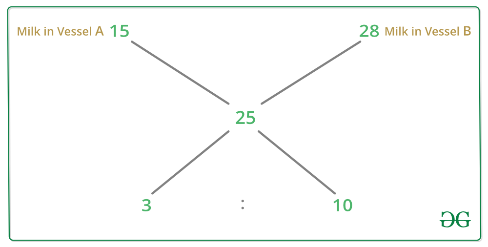 Question 4: Two vessels A and B contain mixture of milk and water in ratios 3:4 and 4:1 respectively. In what ratio should quantities of mixture be taken from A and B to form a mixture in which milk to water is in the ratio 5:2?