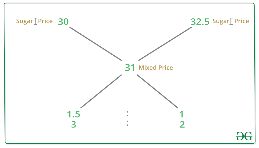 Question 3: In what ratio must a shopkeeper mix sugar at Rs 30/kg and Rs 32.5/kg, so that by selling the mixture at Rs 34.1/kg he may gain 10%.