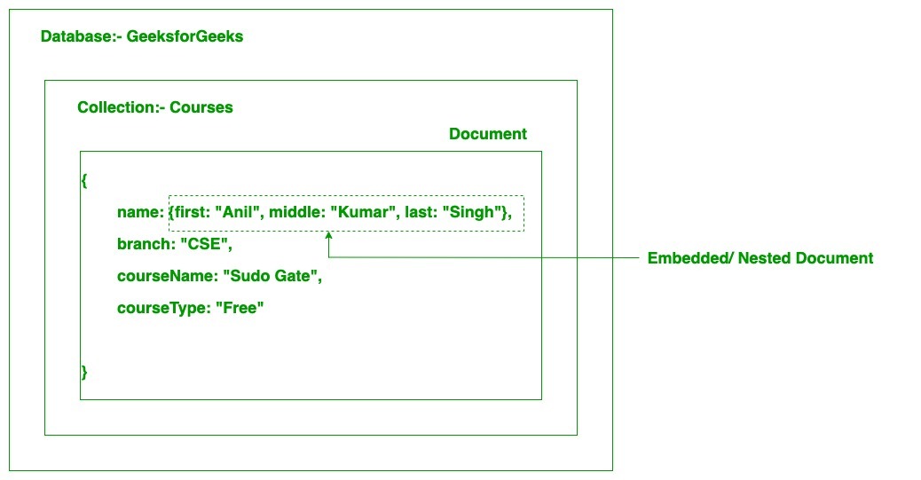 MongoDB - Embedded Documents Last Updated : 17 Sep, 2025 Comments Improve Suggest changes 6 Likes Like Report MongoDB provides you a cool feature which is known as Embedded or Nested Document. Embedded document or nested documents are those types of documents which contain a document inside another document. Or in other words, when a collection has a document, this document contains another document, another document contains another sub-document, and so on, then such types of documents are known as embedded/nested documents. Notes - In MongoDB, you can only nest document up to 100 levels. The overall document size must not exceed 16 MB.Creating Embedded Documents -In MongoDB, you can easily embed a document inside another document. As we know that in the mongo shell, documents are represented using curly braces ( {} ) and inside these curly braces we have field-value pairs. Now inside these fields, we can embed another document using curly braces {} and this document may contain field-value pairs or another sub-document. Syntax: {....field: {field1: value1, field2: value2}....}Let us discuss this concept with the help of the given examples - Example 1: Suppose we have a database named 'GeeksforGeeks'. Now this database has a collection named 'Courses' and this collection contains a document. Inside this document, we have a field named 'name' which contains another document and this document contain three fields(i.e, first, middle, last) with their values. Example 2: Again, we are taking GeeksforGeeks database. Inside this database, we already have a collection named 'Courses', now we add another document in this collection, which contains the details of the student who select paid courses. Inside this document, we have a field named 'courseDetails'. This field contains a document and this document contains some field-value pairs and a sub-document which contains the paymentDetials. So, overall the Courses collection contains two documents and these documents contain nested documents. Create Quiz Comment A ankita_saini Follow 6 Improve A ankita_saini Follow 6 Improve Article Tags : MongoDB MongoDB Explore IntroductionHow do Document Databases Work?6 min readHow MongoDB works ?4 min readMongoDB Introduction3 min readMongoDB: Getting Started5 min readMongoDB - Working and Features6 min readDifference between RDBMS and MongoDB5 min readMongoDB vs MySQL5 min readInstallationHow to Install and Configure MongoDB in Ubuntu?5 min readHow to Install MongoDB on MacOS6 min readHow to Install MongoDB on Windows?5 min readBasics of MongoDBMongoDB - Database, Collection, and Document6 min readMongoDB Cursor9 min readDataTypes in MongoDB8 min readWhat is ObjectId in MongoDB5 min readWhat is a MongoDB Query?10 min readMongoDB - Create Database using Mongo Shell4 min readMongoDB | Delete Database using MongoShell4 min readMongoDB CRUD Operations3 min readMongoDB MethodsMongoDB - Insert() Method6 min readMongoDB insertOne() Method - db.Collection.insertOne()3 min readMongoDB insertMany() Method - db.Collection.insertMany()6 min readMongoDB - Bulk.insert() Method2 min readMongoDB - bulkWrite() Method8 min readMongoDB - Update() Method7 min readMongoDB - updateOne() Method4 min readMongoDB updateMany() Method - db.Collection.updateMany()4 min readMongoDB - Find() Method3 min readMongoDB - FindAndModify() Method6 min readMongoDB - FindOne() Method3 min readMongoDB - findOneAndDelete() Method6 min readMongoDB - db.collection.findOneAndReplace() Method6 min readMongoDB - db.collection.findOneAndUpdate() Method5 min readMongoDB - sort() Method5 min readMongoDB - copyTo() Method3 min readMongoDB Count() Method - db.Collection.count()5 min readMongoDB - countDocuments() Method5 min readMongoDB - Drop Collection4 min readMongoDB Remove() Method - db.Collection.remove()5 min readMongoDB - db.collection.deleteone()2 min readMongoDB - Distinct() Method3 min readMongoDB - limit() Method4 min readMongoDB - skip() Method4 min readMongoDB | ObjectID() Function2 min readMongoDB - db.collection.CreateIndex() Method7 min readcreateIndexes() Method in MongoDB5 min readMongoDB - getIndexes() Method4 min readMongoDB dropIndex() Method5 min readMongoDB - dropIndexes() Method3 min readComparison OperatorsMongoDB - Comparison Query Operators2 min readMongoDB $cmp Operator4 min readMongoDB $gt Operator4 min readMongoDB - $lt Operator4 min readMongoDB - $eq Operator4 min readMongoDB - $lte Operator2 min readMongoDB - $gte Operator2 min readMongoDB - $ne Operator2 min readMongoDB $in Operator4 min readMongoDB - $nin Operator2 min readLogical OperatorsMongoDB - Logical Query Operators3 min readMongoDB AND operator ( $and )4 min readMongoDB OR operator ( $or )6 min readMongoDB NOT operator ( $not )5 min readMongoDB NOR Operator ( $nor )4 min readArithmetic OperatorsMongoDB $add Operator4 min readMongoDB $subtract Operator4 min readMongoDB $multiply Operator4 min readMongoDB $divide Operator4 min readMongoDB $abs operator4 min readMongoDB $floor Operator4 min readMongoDB $ceil Operator3 min readMongoDB $mod Operator1 min readMongoDB $sqrt Operator2 min readMongoDB $pow Operator4 min readMongoDB $exp Operator3 min readMongoDB $log Operator3 min readMongoDB $log10 Operator3 min readMongoDB $ln Operator5 min readField Update OperatorsMongoDB - Field Update Operators5 min readMongoDB - $max Operator4 min readMongoDB - $min Operator5 min readMongoDB - $inc Operator5 min readMongoDB - $mul Operator5 min readMongoDB - Rename Operator ($rename)5 min readMongoDB - Current Date Operator ($currentDate)2 min readMongoDB - $setOnInsert Operator4 min readMongoDB Bitwise Update Operator3 min readArray Expression OperatorsMongoDB - $isArray Operator6 min readMongoDB $size Operator5 min readMongoDB $arrayElemAt Operator5 min readMongoDB $concatArrays Operator4 min readMongoDB $reverseArray Operator5 min readArray Update OperatorsMongoDB $pull Operator5 min readMongoDB - $pop Operator4 min readMongoDB - $pullAll Operator3 min readMongoDB $push Operator5