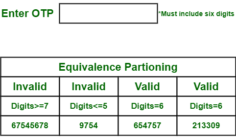 Consider an OTP number that contains only 6 digit number, greater and even less than six digits will not be accepted, and the application will redirect customer or user to error page. If password entered by user is less or more than six characters, that equivalence partitioning method will show an invalid OTP. If password entered is exactly six characters, then equivalence partitioning method will show valid OTP.