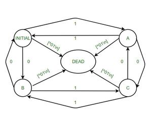 LEX provides us with an INITIAL state by default. So to make a DFA, use this as the initial state of the DFA. We define four more states: A, B, C, and DEAD where DEAD state would be used if encountering, a wrong or invalid input. When user input an invalid character, move to DEAD state and print message “INVALID” and if input string ends at state INITIAL then display a message “Accepted”. If input string ends at state A, B, C then display a message “Not Accepted”.