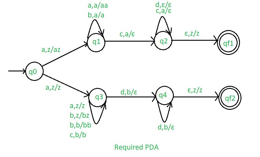 In designing a NPDA, for every a’, ‘b’, ‘c’ and ‘d’ will comes in proper order.