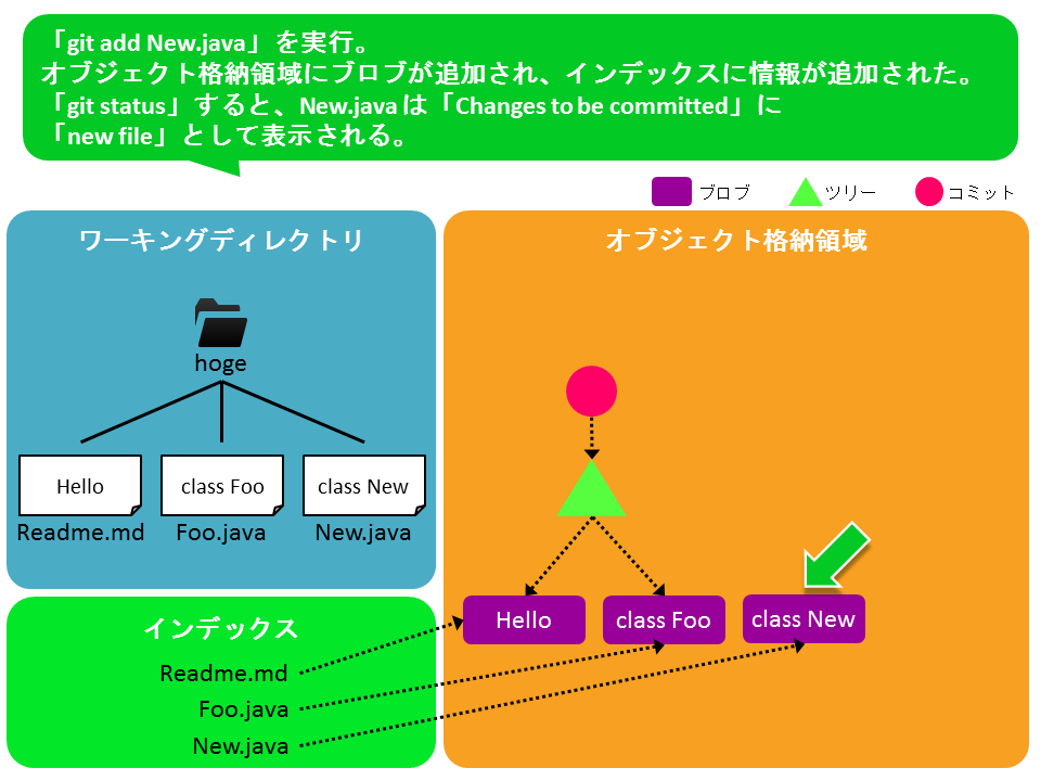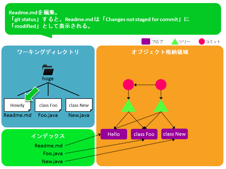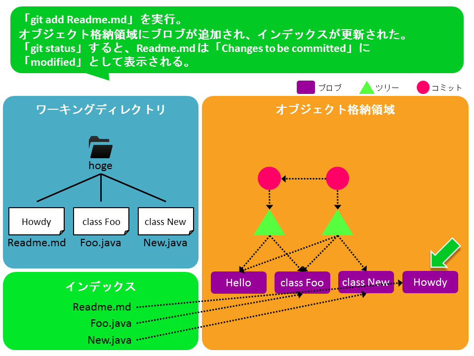 ワーキングディレクトリに変更を入れ、git add、git commitをする中で、オブジェクト格納領域とインデックスがどう変化するかを図にした。