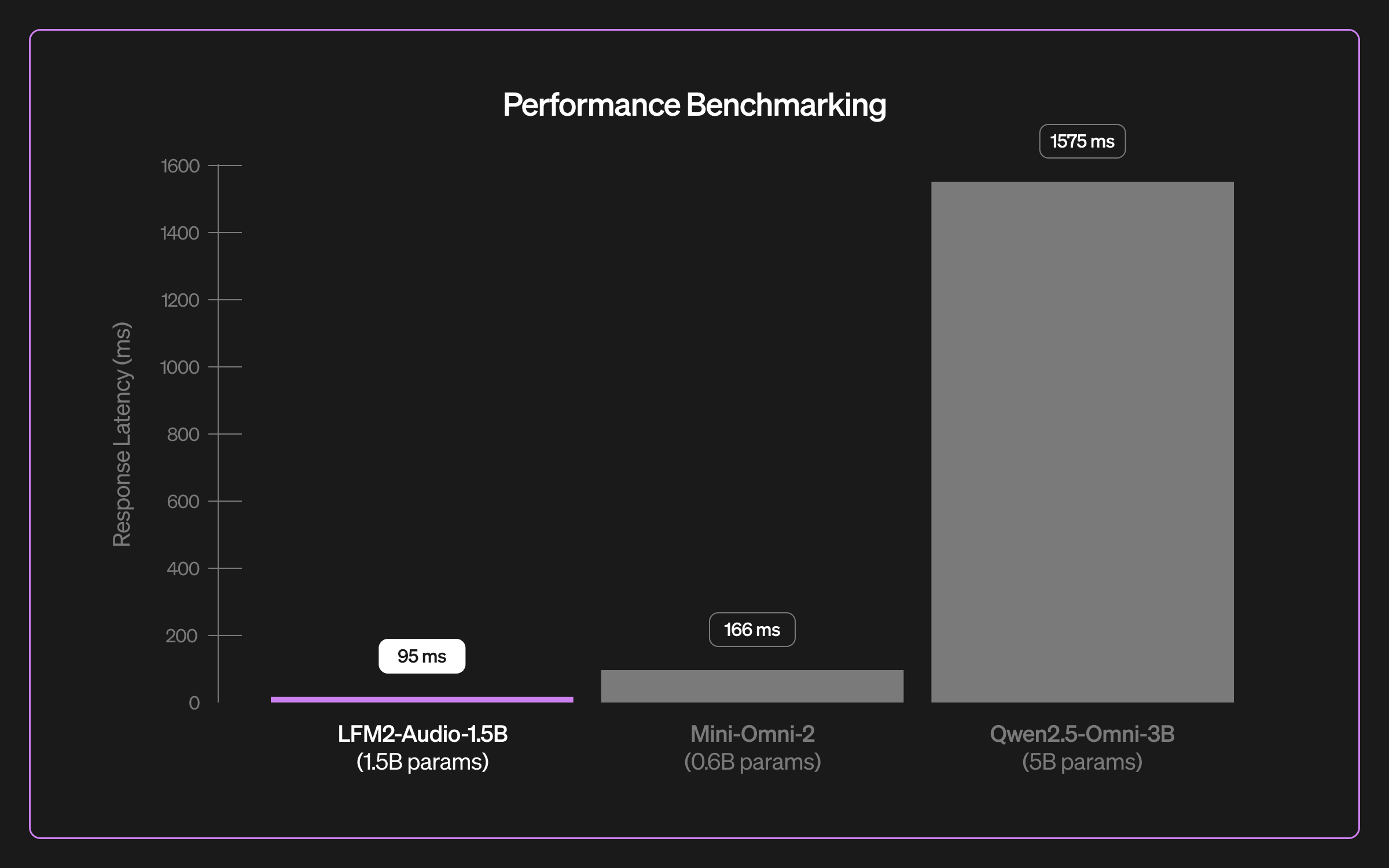 Efficiency is critical for audio models as they run in interactive real-time scenarios. We measure the latency between a speaker asking a question, and the model starting to reply – representing the perceived latency for interactive use. The model is provided with an input waveform (4 seconds), and the time to generate the first audible sound from the model is measured. LFM2-Audio-1.5B achieved an average end-to-end latency of under 100 ms, highlighting superb efficiency, even faster than models much smaller than 1.5B parameters.