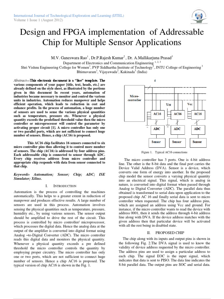 various components of your paper [title, text, heads, etc.] are already defined on the style sheet, as illustrated by the portions given in this document In recent years, automation of industries became necessary to monitor and control the various units in industries. Automation reduces manpower and helps efficient operation, which leads to reduction in cost and enhance profits. In the process of automation, a huge number of sensors are used to sense the various physical quantities such as temperature, pressure etc. Whenever a physical quantity exceeds the predefined threshold value then the micro controller or microprocessor will control the parameter by activating proper circuit [1]. A micro controller has only one or two parallel ports, which are not sufficient to connect huge number of sensors. Hence, a chip (AC16) is proposed. This AC16 chip facilitates 16 sensors connected to six micro controller pins thus allowing it to control more number of sensors. The chip (AC16) is addressed by four address pins. Each addressable chip is connected to sensor through ADC. Every chip receives address from micro controller and appropriate chip responds with data from sensor connected to that chip.