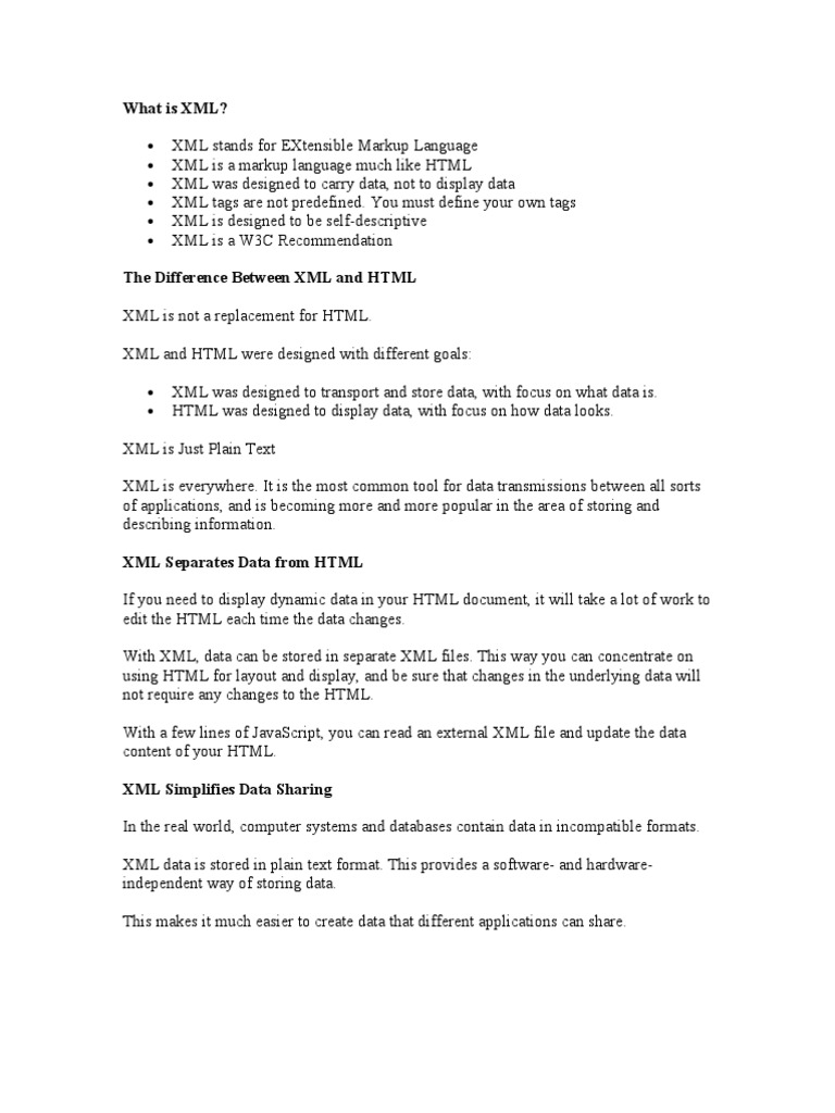 XML is Just Plain Text XML is everywhere. It is the most common tool for data transmissions between all sorts of applications, and is becoming more and more popular in the area of storing and describing information. XML Separates Data from HTML If you need to display dynamic data in your HTML document, it will take a lot of work to edit the HTML each time the data changes. With XML, data can be stored in separate XML files. This way you can concentrate on using HTML for layout and display, and be sure that changes in the underlying data will not require any changes to the HTML. With a few lines of JavaScript, you can read an external XML file and update the data content of your HTML. XML Simplifies Data Sharing In the real world, computer systems and databases contain data in incompatible formats. XML data is stored in plain text format. This provides a software- and hardwareindependent way of storing data. This makes it much easier to create data that different applications can share.